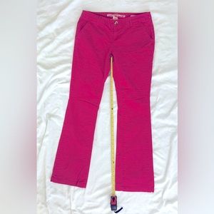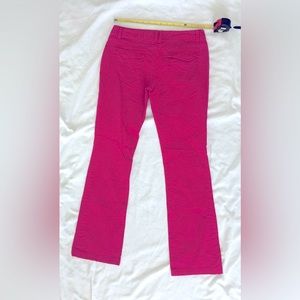 Color is not quite as bright as 1st 3 pics but brighter pink than last. Great comfortable pants, no flaws.
