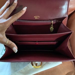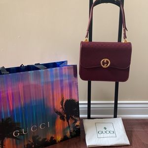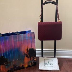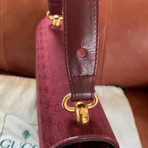 ❤️💛Classy Authentic Vintage Gucci Top Handle Bag with adjustable strap.💛❤️ Bag is a beautiful burgundy/Bordeaux color with Microgucci exterior and leather trim. This bag is very roomy with two compartments; a slip compartment; a snap closure compartment and; a zipper compartment. The bag’s gold hardware is in PRISTINE condition. Gucci gold stamped logo and serial/item number is on the inside of the bag. Gucci bag collectors or anyone who love stylish bags…this bag is a must have!!!!!😍🥰😍