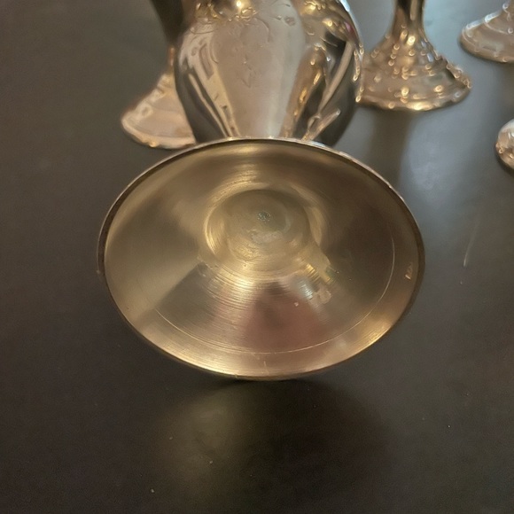 Vintage silver plated wine goblets or dessert cups. Stand 6 inches tall. Lovely floral etching. Good weight to them. No markings to identify maker. Blue tote 1