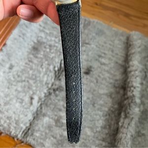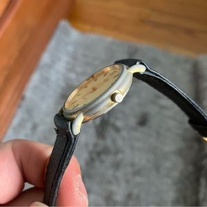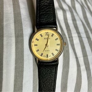 This is an original vintage Suizo watch from the 90s. My mother bought it a few years after I was born in 1984. The leather straps indicate that it has never been used officially and has been stored in a safe location until now. It's still got a monogram on it. Due to its age, the watch's case is fading and requires new batteries.