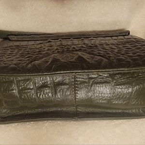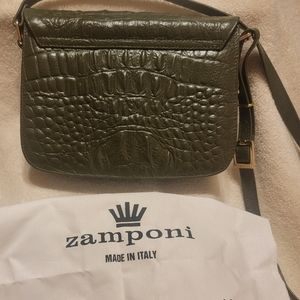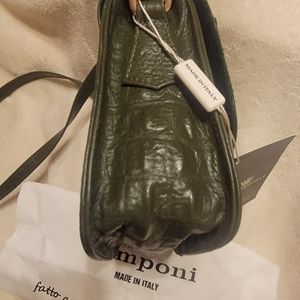 Zamponi Italian leather crossbody bag, New with tags. 8" wide and 6" tall 2" thick, it has magnetic latch. 3 compartments inside and middle is zippered. Forest green in color, with adjustable shoulder strap. comes with a storage bag.