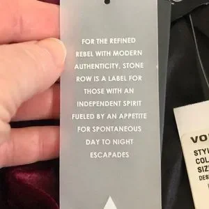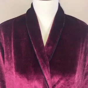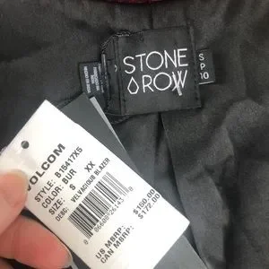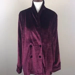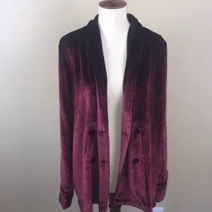 NWT. Beautiful, ultra soft, lined, burgundy velvet jacket from Volcom by Stone Row. Double breasted look with extra buttons in front. Black trim, lining, and buttons. Wear this gorgeous jacket for any fancy event. Size Small.
