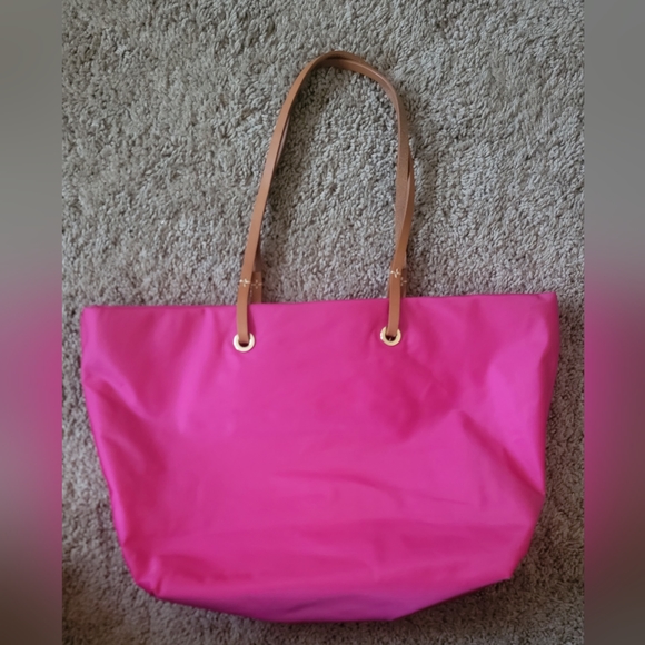 @ang76977 "Available in an array of hues, this durable nylon carryall tote is defined by minimalist, clean lines and hands-free accessibility. Our signature gold-plated hardware and vachetta leather trim add a heritage stamp to this compact classic.Addison fuscia pink H 11" x W 5.75" x L 12.5" One outside zip pocket. One inside zip pocket. Two inside pockets. Cell phone pocket. Inside key hook. Handle drop length 10". Top magnet snap closure. Lined."