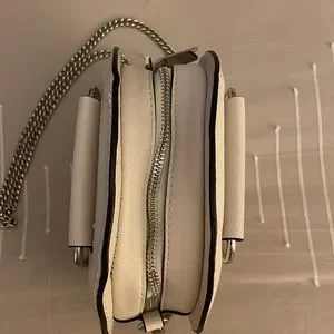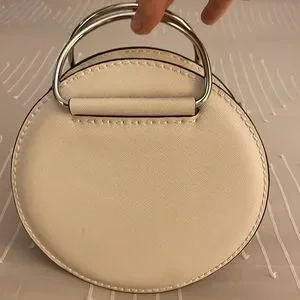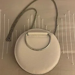 Cream colored round handbag with two silver O ring handles and removable silver chain Strap by Zara.