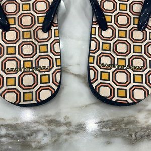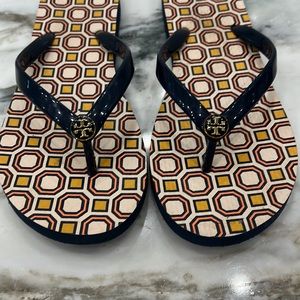 Tory Burch Flip Flops. SZ 7. Navy patent thong. Navy gold logo.