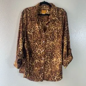 Leopard animal print button down blouse. 97% Polyester, 3% Spandex. Very comfortable and versatile top. Wear to the office, casually or jazz it up with a leather jacket.