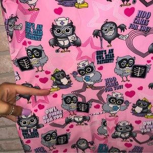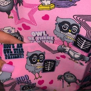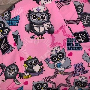 Size XS, and M, new with tags perfect condition, pink with all over print of owls and medical related sayings, comfortable, short sleeve, v neck line, scrub top