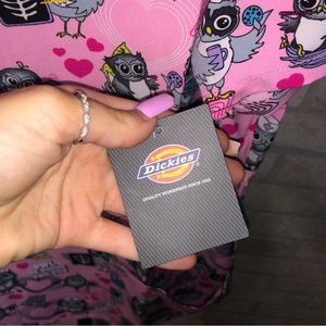 NWT Dickies Owl Print Pink short sleeve v neck scrub top
