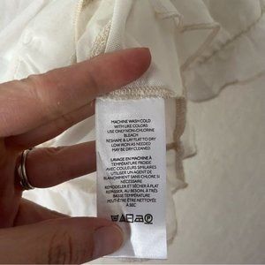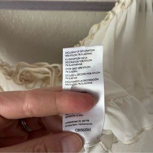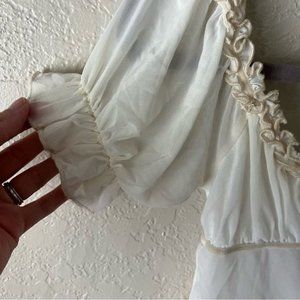 DETAILS: Urban Outfitters size medium. Milkmaid blouse, off the shoulder, ruffle lettuce trim, tie detail, cropped length, sheer/semi-sheer. Nylon spandex, machine wash.