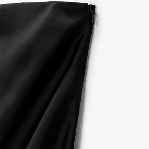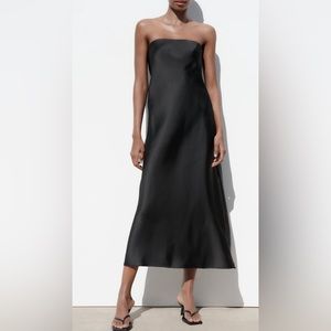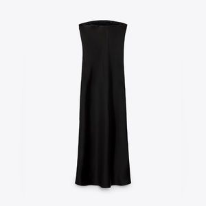 Simply & elegant midi dress with straight neckline, exposed shoulders. Hidden zipper closure