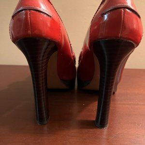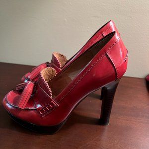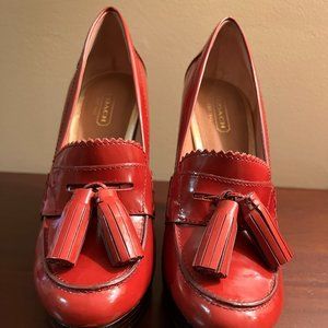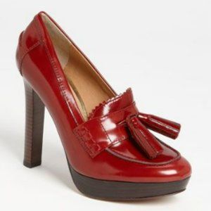 A stacked heel and platform elevate a loafer pump with pinked trim and twin tassels.