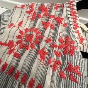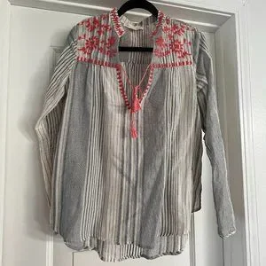 V neck with coral embroidered accents.