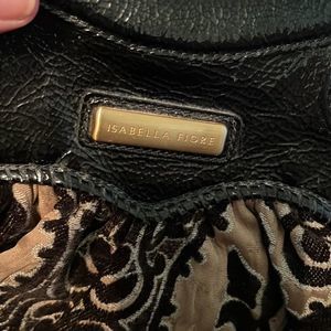 10x14 inches.Patent leather and fabric.Black and tan in colors.Has a couple of marks inside the bag(see photo) overall a gorgeous bag.Very rare.Only one other.