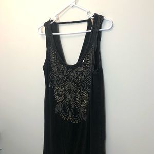 Beautiful sequin free people top in excellent pre-loved condition! Circa 2013. Washed dark grey/ almost black sleeveless high low long top with cut out back. It is almost as long as a short dress (31” front / 34” back), but it has high slits on the sides so something would need to be worn underneath to wear it as a dress. Width is 15”. It is very comfortable and elegant! From a non-smoking home.
