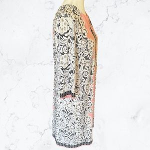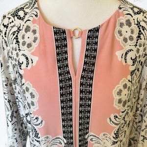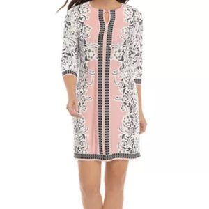 Sandra Daren embellished with a puff lace print dress size petite large. This dress has a stylish split neck detailed by a gold-tone ring for a hint of glamour. It is a pullover, split neck, 3/4 set-in sleeves dress with yoke. It is unlined and has a floral pattern. It is unlined. No stains, loose threads, or pilling. In like-new condition.