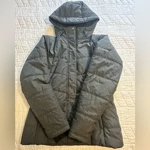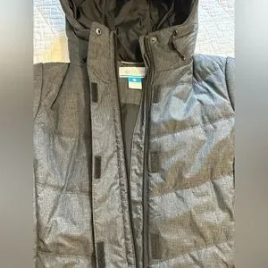 Columbia winter jacket size S. Zip up and button up. Two zip pockets outside & one Velcro pocket inside. Cinches on both sides as well as hood. Small tear in fabric but not very noticeable (last 2 pictures).
