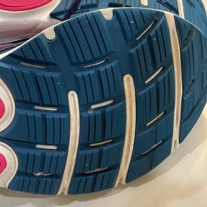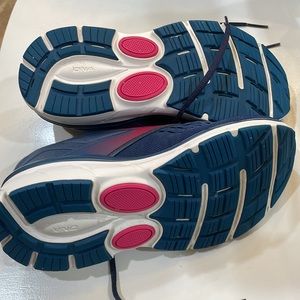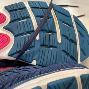 Brooks Women's Dyad 11 Running Shoe. Blue/Navy/Beetroot color. Size 7. EUC. No stains or rips in the shoe. I pointed out the flaw on both of the heels in the last picture. The flaws do not show when wearing the shoe