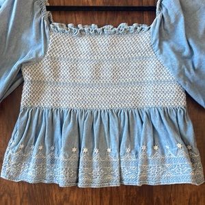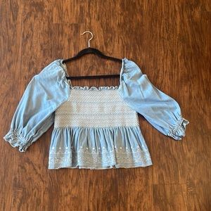 EUC worn once. Super cute smocked baby doll style top. Denim material with unique detailing! Can be worn on or off the shoulder. Comes from smoke and pet free home.