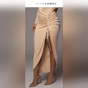 BUTTERCREAM HANNA SLINKY SKIRT is so captivating you'll have all eyes on you! Crafted in our slinky fabric, this maxi length skirt features an adjustable drawstring on one side with ruched detail and a flirty side slit. Complete with an adjustable drawstring for the desired length!