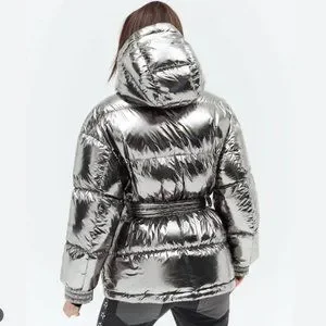 Oversize belted Parka from PERFECT MOMENT featuring silver, metallic effect, padded design, classic hood, front button fastening, belted waist, long sleeves and straight hem.
