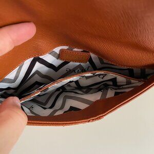 Bright and shiny gold tone hardware compliments cognac colored vegan leather