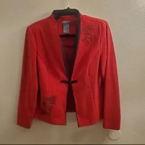 This red jacket by Koret is red with black trim, button closure and embroidery. It has shoulder pads. 97% polyester, 3% spandex, has a microfiber, faux suede feel. Like new condition.