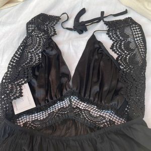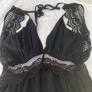 This dress is gorgeous on. It was bought in a boutique and I loved it on! Never Worn! It has gathered triangle deep V top with beautiful lace detail up the sides and through the tie back which moves to show as much or as little lace depending on how you want it to look. Lace through center of bodice. Elastic around center and around bodice into a free flowing skirt with ruffle on the bottom