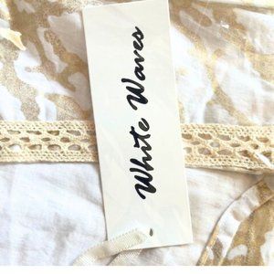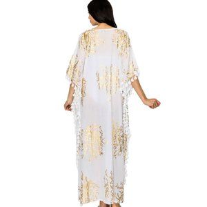 Women’s NWT Elegant White and Metallic Gold Pom Pom Long Kaftan, One Size.