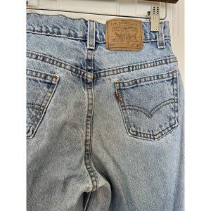These vintage Levi's 550 jeans are a must-have for any vintage fashion fan. With a classic button closure and relaxed fit, these jeans are perfect for a comfortable and stylish look. The light wash denim fabric gives a vintage feel and the orange Levi's tab adds a touch of nostalgia. The high-rise waist and 28 inch inseam make these jeans suitable for someone with a waist size 26 inches. The cotton material and denim fabric type ensure durability and comfort. These jeans also feature pockets for added convenience. The Levi's 500 Series product line is known for its quality. Add these 90s-themed, relaxed fit jeans to your wardrobe today!