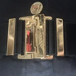 Gucci Dress with gold tone Gucci buttons and elastic black belt. Size UK 40