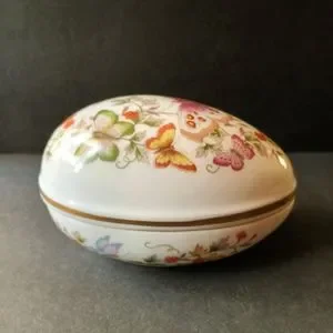 1974 Avon egg shaped lidded trinket dish produced exclusively for Avon Products. Painted with flowers and butterfly, trimmed in 22K gold, made in Japan. Measures 3" tall with lid, 6" long and 4" long. Excellent condition, no chips, cracks or crazing. Please view all photos I have listed which include measurements.