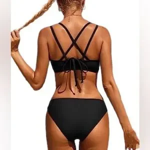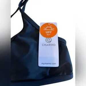 Charmo Strappy black V Neck athletic bikini High Cut Low Rise Bikini, size small. With UPF 50+. Peekaboo string accent on bikini bottom sides. Bikini top has removable bra padding. NWT.
