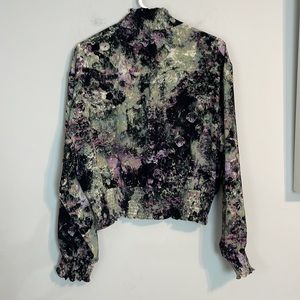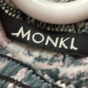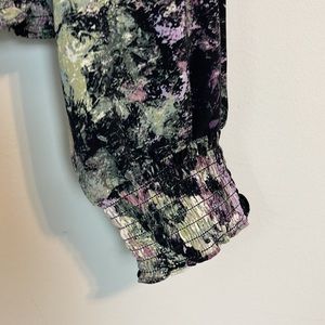 Beautiful Monkl floral abstract blouse. Elastic at the waist band, cuffs and at the neck line. I love this blouse and I would keep it but unfortunately it is too big for me