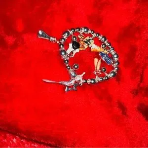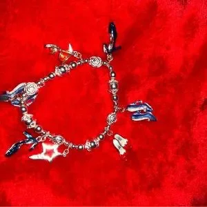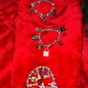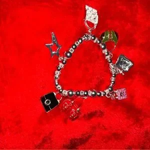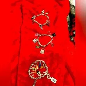 Set of 3 brand new silver stretch bracelets. There is one with purses, one with shoes, and one with dresses. They all also include crystals. Each come in a plastic bag. The silver is beautiful. Very cute and whimsical!
