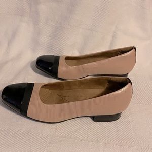 CLARKS KEESHA ROSA LEATHER FLATS. PATENT LEATHER TRIM. EXTRA CUSHIONED. VERY COMFY. NEW, WITH TAGS STILL ATTACHED (NO BOX) SIZE 9. CLARKS WORKMANSHIP. DUSTY PINK LEATHER, BLACK PATENT LEATHER TOE
