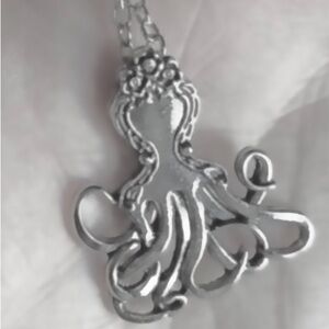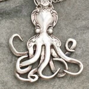 “Vintage Fork Octopus” Silverware Flatware Spoon Squid Octopod Polypus Kraken Sea Monster Tentacled Creature Deep Sea Underwater Marine Life Pirate Ship Ocean Beach Island Tropical Mermaid Vacation Necklace. A vintage fork was melted down & repurposed with the floral handle as the octopus’ mantle, the fork neck as the octopus’ head, and the fork tines as the octopus’ arms (or tentacles in a squid.) The arms curl, wrap around, and flow to give the appearance that the octopus is floating in the ocean. On a link chain. New.