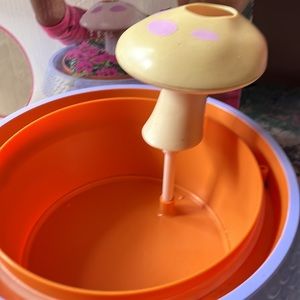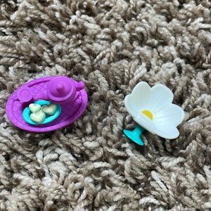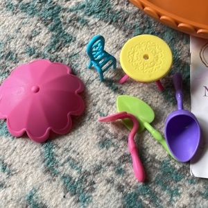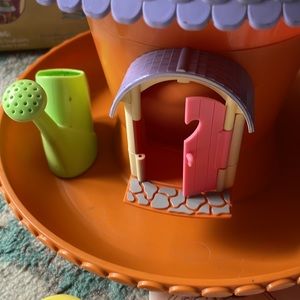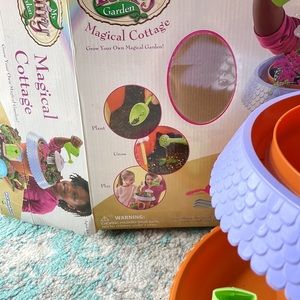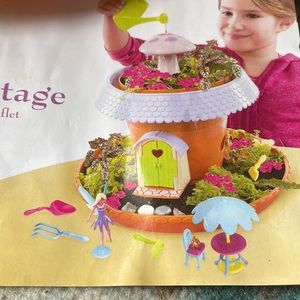 My fairy garden magical cottage. Missing some parts. Stick to attach umbrella to the table. One of the doors on the front. The fairy (if it came with one. I can’t remember). Cute set. Tiny tea set and flower chair added.