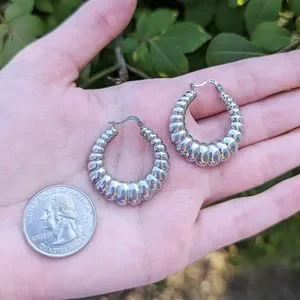 Vintage sterling silver 925 pierced earrings hollow shrimp hoops. Light weight and comfortable. Scalloped design. Latch secured closure. 3D puffy. Real genuine silver.