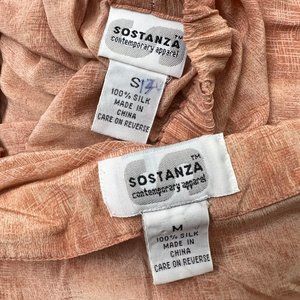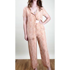 Stunning vintage silk matching loose pants & blouse shirt by Sostanza. This set features an elastic waistband straight leg, short sleeves, & button up front closure. Absolutely perfect set for this spring & summer. This beautiful set can be worn to picnics in the park, baby showers, garden parties, date nights, drinks with friends, or on a romantic getaway vacation. Also great to mix and match with other pieces in your closet. Guaranteed to get you so many compliments when you wear either of these pieces!