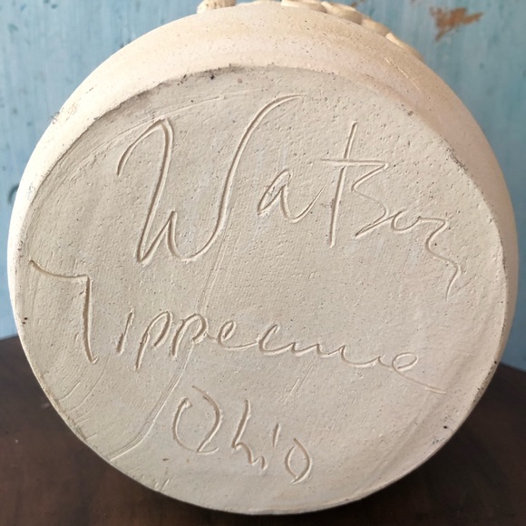 Gorgeous hand-made wine bucket in off-white with raised bunches of grapes and stems all around the outside. It would look great, with almost any style of decor, on your table. Will keep your whites and roses cold and can catch any drips from your reds. Measures 7-1/2“ tall and 5-1/2“ in diameter. Made in artisan shop in Tippecanoe, Ohio, an area that is known for pottery. Signed by the artist on the bottom. This would make a fabulous gift! (Wine not included.)