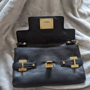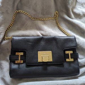 Medium-sized clutch (11x6 inches) with multiple card slots, a zippered interior pocket, clasp closure, and short gold-coloured chain.
