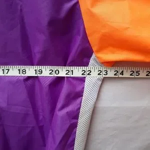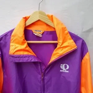 vintage cycling jacket, 100% polyester with mesh side panels. approx measurements pictured across chest and shoulder to hem, back is a few inches longer than the front.