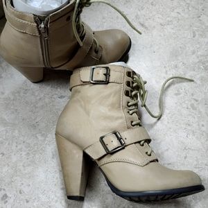 this is a Seychelles beige ankle length boot with lace tie ups and buckle as a trim. US size 8 and worn a few times only. good condition and ready to pair it with coord sets and suits