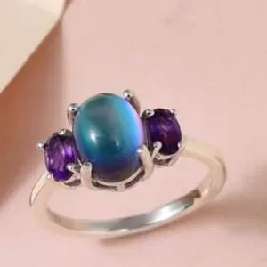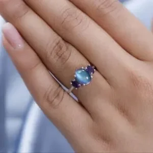 This trilogy ring features a center, Aurora Moonstone, highlighted on each side by a Lusaka Amethyst gemstone. The amethysts are a deep purple color, while the moonstone has an iridescence effect that gives it a mystical quality. It is enchanting to look at. Size 8 Brand new.