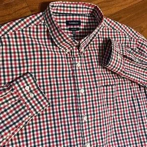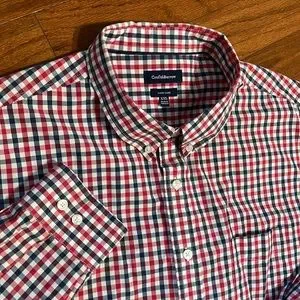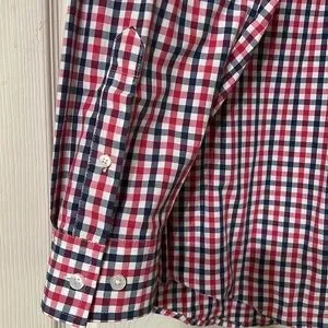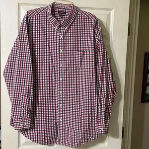NWOT… this medium weight button-down has never been worn or washed. Size 2X, the navy and red plaid design is perfect for a casual outing. From a non-smoking home.