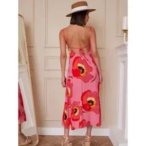 1 left! Sleeveless Button Up V-neck Open Back Printed Midi Dress