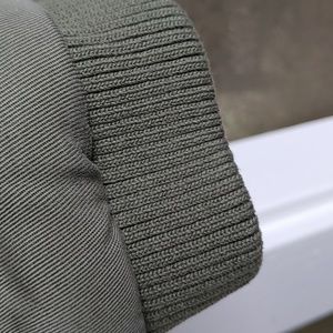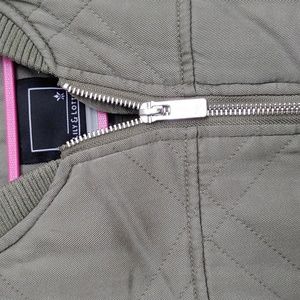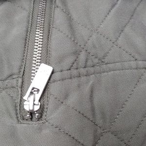 Light olive green quilt style jacket w ribbing at neckline and wrists, zipper clousure w front zip pockets. She'll is 100% Tencel, lining 100% cotton, filling and ribbing is 100% polyester. excellent condition.