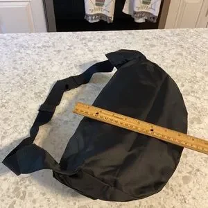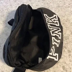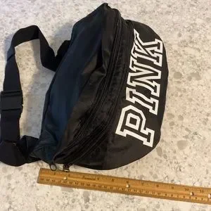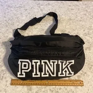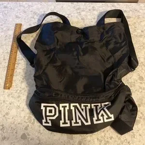 NWOT convertible large belt/crossbody bag with adjustable strap…. Converts to a drawstring back sack with 2 adjustable shoulder straps for carrying as a backpack. When used as a backpack, the bottom zippered compartment is extra storage! PINK in large white letters on a black bag. Folds up for easy travel.