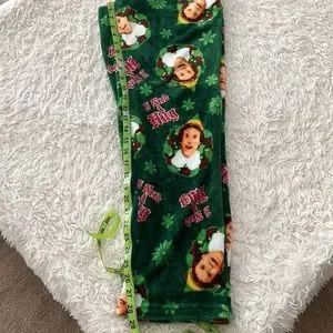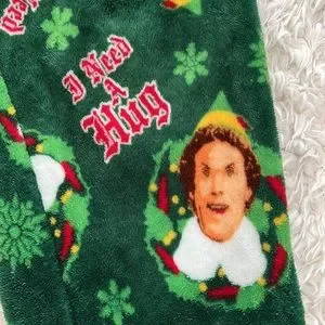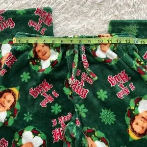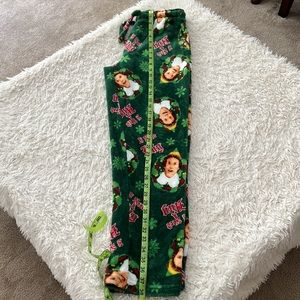Green Christmas ELF pajama pants from the brand ELF. They are a fleece material and have a string to tighten the waist. They also say "I Need A Hug" all over with Buddy's face.