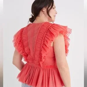 Anthropologie Geisha Designs Nanette Ruffled Ruched Tulle Blouse Pink.